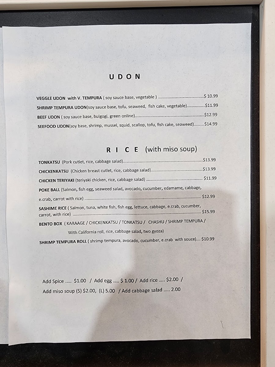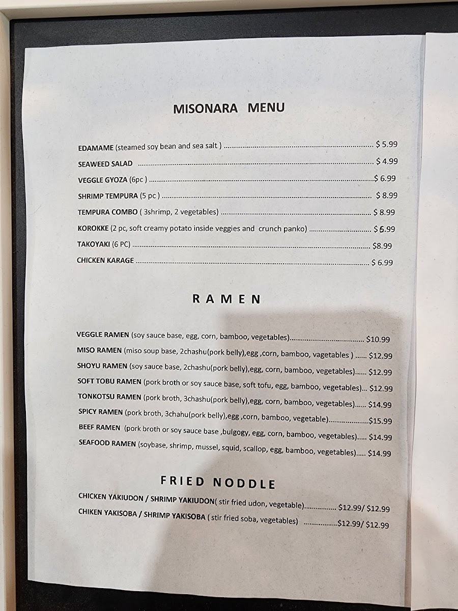From a reviewer’s perspective, the menu at The Miso Nara delivers a concise yet satisfying overview of classic Japanese comfort food, making it easy for diners to find something that suits their mood. The appetizer selection sets the tone with familiar starters like Korokke, 새우튀김, and A8. Veggie Gyoza, offering a balance between crispy textures and lighter vegetable-forward bites. Moving into noodles, the restaurant shows its strength with a diverse lineup that includes Ni. Veggie Udon, N7. Shoyu Ramen, Tempura Udon, N4. Shrimp Yaki Soba, and N6. Tofu Ramen, covering both broth-based and stir-fried styles, as well as vegetarian-friendly options. For those who prefer rice-based dishes, R3. Shime Rice provides a simple yet comforting choice that pairs well with many of the main items. Fans of pan-fried noodles will appreciate the savory appeal of Chicken Yakiudon and Chiken Yakisoba, both delivering bold flavors and satisfying portions. The “Others” section rounds out the menu with crowd-pleasing classics such as Chicken Karaage, Chicken Teriyaki, Tonkatsu, Chicken Katsu, and Shrimp Tempura, highlighting the kitchen’s focus on crispy coatings, rich sauces, and hearty proteins. Overall, the menu at The Miso Nara feels thoughtfully curated, emphasizing well-known Japanese dishes that are approachable, filling, and consistently appealing, making it a solid choice for both newcomers and regulars looking for reliable Japanese flavors in Naperville.